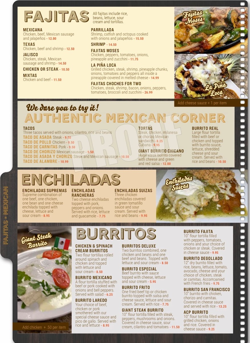 Flour tortilla stuffed with tender slices of beef or chicken cooked with onions and bell peppers. Served with beans, lettuce, and sour cream.