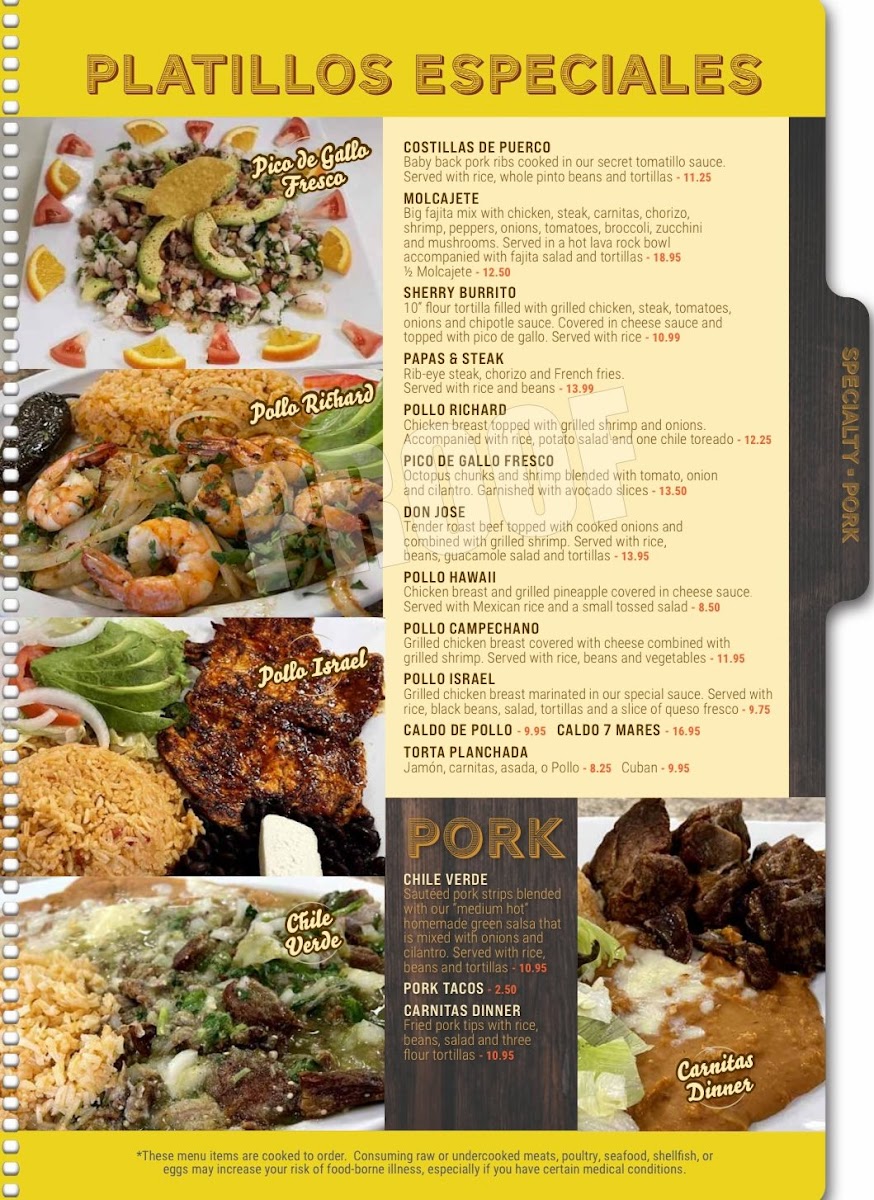 Tender slices of steak cooked with bacon, peppers, onions, and pineapple. Covered with shredded cheese. Served with rice, beans, and tortillas. These menu items are cooked to order. Consuming raw or undercooked meats, poultry, seafood, shellfish, or eggs may increase your risk of food-borne illness, especially if you have certain medical conditions.
